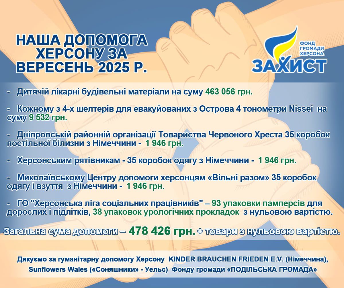 У вересні Фонд громади міста Херсон «Захист» разом із партнерами передав допомоги на суму 478 426 грн та товари з нульовою вартістю для різних категорій херсонців.