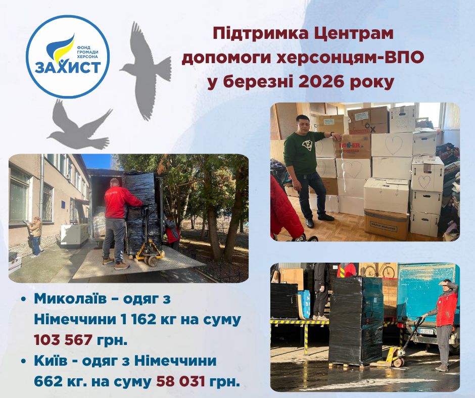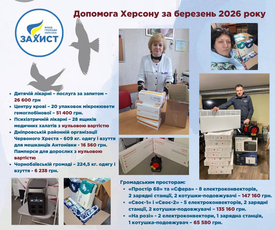 In March 2026, the Community Foundation of Kherson “Zakhyst” allocated UAH 610,096 to support the community. The assistance covered medical institutions, humanitarian needs, and support centers for internally displaced persons (IDPs).